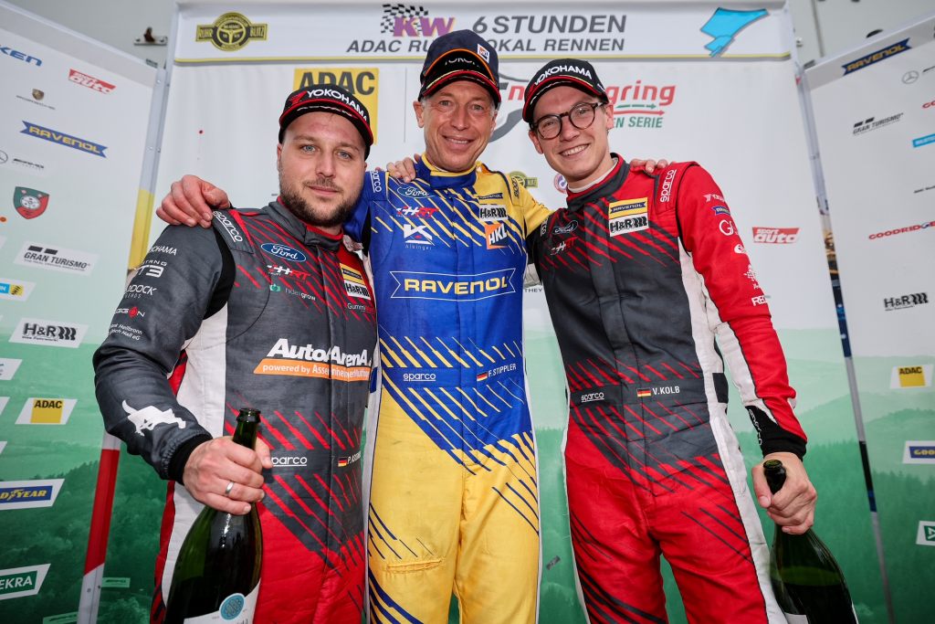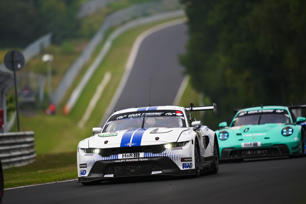 Zum Rennstart dann typische Eifelbedingungen, Nieselregen und in mehreren Streckenabschnitten auch Nebel. Regen und Nebel wurden über die gesamte vierstündige Renndistanz mal mehr und mal weniger und bestimmte den Rennverlauf, die Stopps und die Reifenwahl maßgeblich. Unschlagbar dabei die beiden Falken-Porsche GT3R, die dadurch auch einen erneuten Doppelsieg feiern konnten. Der HRT-Mustang mit der Startnummer 6 überquerte die Ziellinie als Gesamtdritter, lediglich 57 Hundertstelsekunden zurück Patrick Assenheimer als Gesamtvierter. Der konnte in seinem Schlussstint das Delta von 45 Sekunden Rückstand auf das Schwesterfahrzeug zufahren. „Ein Überholmanöver wäre allerdings bei diesen Bedingungen zu gefährlich gewesen, mit dem vierten Gesamtrang sowie dem Klassensieg in der SP9 PROAM bin ich hochzufrieden“ so das Resümee von Patrick Assenheimer.