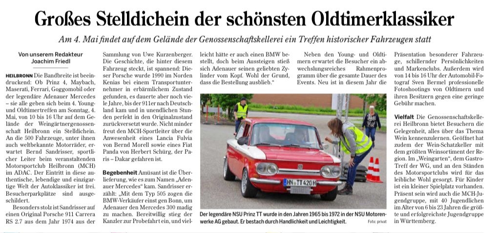 Vor-Bericht in der Heilbronner Stimme zum 4. MCH/ADAC Old- und Youngtimer-Treffen 2025 von Joachim Friedl