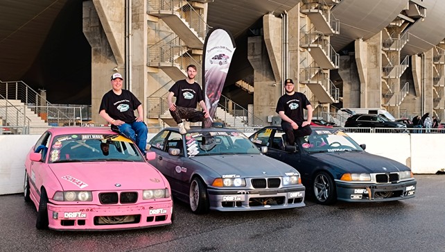 Ein besonderes Highlight des Wochenendes war der Besuch von Volker Strycek, der sich die Drift-Szene einmal aus nächster Nähe anschauen wollte. Nach einigen Runden als Beifahrer wagte er sich selbst ans Steuer von Stevens BMW. Doch bevor es so weit war, demonstrierten unsere Fahrer in Battles und Trains, wie anspruchsvoll das enge und synchrone Driften ist.