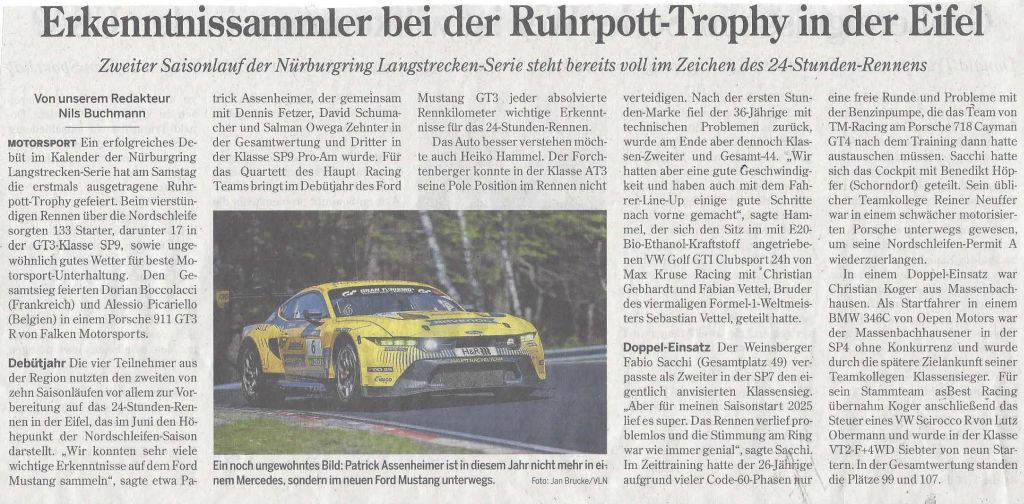 Seine Mitstreiter beim ersten Einsatz waren Dennis Fetzer, David Schumacher und Salman Owega. Das Quartett hat sich schnell an den nagelneuen Boliden gewöhnt, Startplatz 12 unter den 136 Akteuren – davon 17 in der GT3 Klasse SP9 - war zufriedenstellend. Die Vier-Stunden-Hatz verlief ebenfalls problemlos, im Ziel wurde der Mustang als Gesamtzehnter abgewunken. In der Klasse SP9 Pro Am erreichte Patrick mit seinen Kollegen den zweiten Platz – Rückstand auf den Gesamtsieger 4.13.46 Minuten. Dies war wie beim 2025er Auftaktrennen ein Porsche 911 GT3 R des Falken-Teams. „Wir konnten sehr viele wichtige Erkenntnisse auf den Ford Mustang GT3 als Vorbereitung für das 24-Stunden-Rennen am 21./22. Juni sammeln“, so das Resümee von Patrick Assenheimer, der bereits am 10 Mai erneut im Ford Mustang beim 3. Lauf zur NLS in der Eifel starten wird.