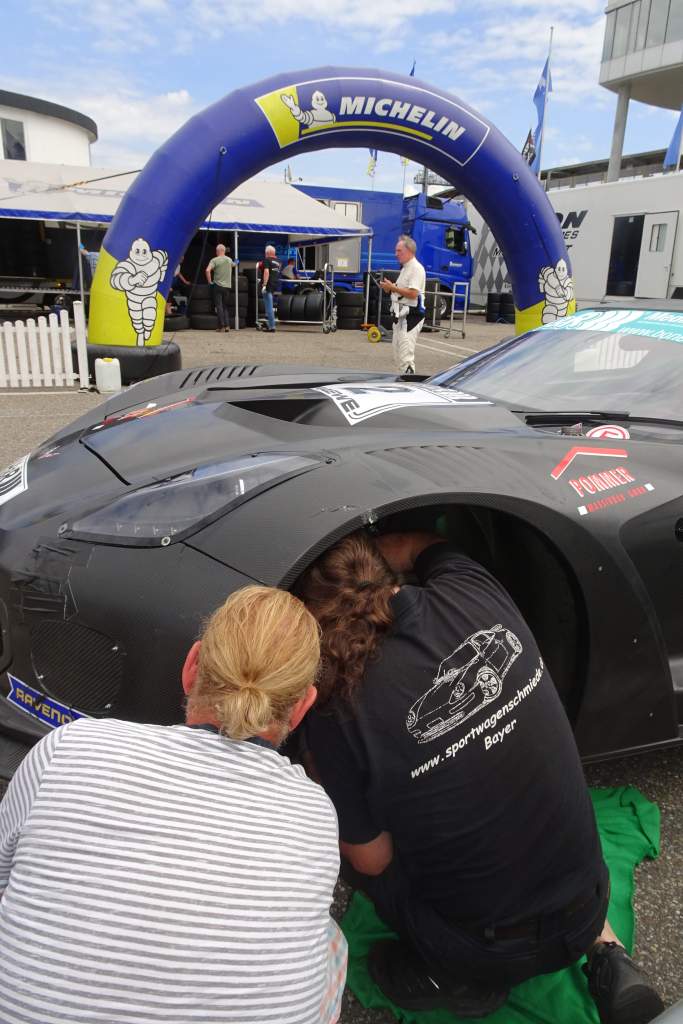 Die Fans werden sich erinnern. Beim letzten Meisterschaftslauf vor 3 Wochen auf dem Grand Prix-Kurs von Hockenheim explodierte Jürgen Bender im 2. Zeittraining der linke Hinterreifen. Ein fast 2 Meter langes Teil der Lauffläche des Reifens zerschlug wie eine Peitsche den hinteren linken Karbon-Kotflügel der Corvette völlig. Aus den Einzelstücken ließ sich zum Glück wieder ein provisorisches Teil laminieren. Daheim in der Werkstatt stellte sich heraus, dass auch das untere Heck und der Schweller links schwer beschädigt waren. Auch diese Teile mussten ersetzt werden. Das war zeitlich nur mit Mühe zu schaffen. Aber Vorgesten war alles wieder montiert.